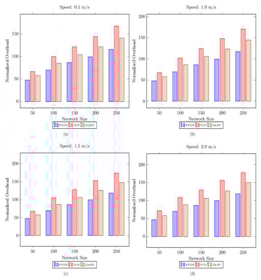Figure 9a–d show the results at speed 0.5 m/s, 1.0 m/s, 1.5 m/s and 2 m/s respectively). The dominant factors in overhead reduction are the dynamic replication of mapping information and alternate paths avoiding faulty nodes. These measures make possible resolutions of lookups with minimum possible overhead in the presence of faulty nodes (i.e., AN failures, network partition) since nodes can find mapping data at nearby replicas despite forwarding lookup requests too far away distant ANs. However, the case is different in VCP and DART; for example, deploying and locating replicas (i.e., ring search) in VCP need extra transmissions and cause more overhead. Similarly, in DART, lookup queries are resolved far away from actual AN (i.e., no replication); that is why DART produces more overhead than FTDN. Moreover, growing network size and increasing mobility produce more overhead in all protocols, but FTDN still performs well than VCP and DART. A slight increase in FTDN, with an increase in mobility, is due to the recurrent execution of LS recovery, LIDs reassignment, and merging processes; similarly, growing network size increases an average number of hope counts to reach AN; eventually, this increases overhead per lookup request. However, this impact is lower in FTDN as compared to VCP and DART as depicted in