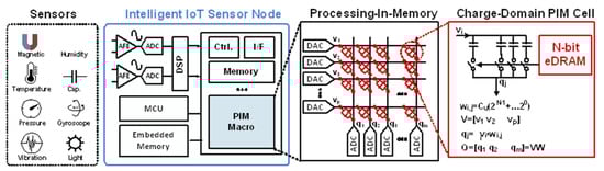 In recent years, studies have extensively investigated energy-efficient hardware for deep neural network (DNN) applications. One such approach is the processing-in-memory (PIM) or computing-in-memory architecture that realizes efficient data processing to overcome the memory-processor bottleneck. A low-power and compact implementation of a DNN with PIM can be used to realize intelligent Internet-of-Things (IoT) sensor nodes, as illustrated in Figure 1.