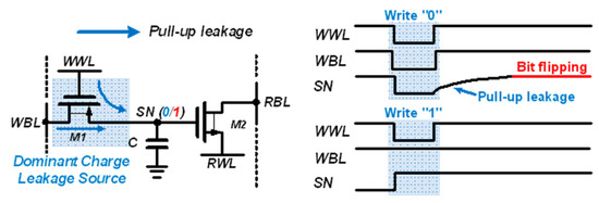 Therefore, the leakage current must be reduced to extend the data retention time. Charge leakage that results in data loss is caused by two reasons. First, assuming that the WBL and WWL are maintained high (“1”) during hold operation, the subthreshold current of M1 induces a current into the SN, and the voltage of SN can be increased by the leakage current of M1. If SN stores data “0”, the leakage current of M1 increases its voltage and the stored data flips to “1”, as shown in Figure 3.