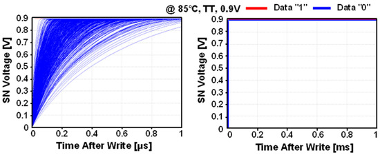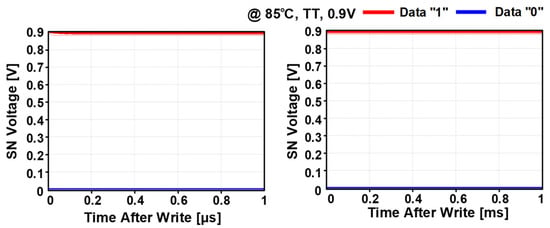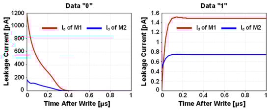 Figure 4 shows the simulated leakage current waveforms after the write operation. In case of storing data “0”, a large amount of leakage current was injected after the write operation via M1, increasing voltage of SN. Compared with stored data “0”, the leakage current for stored data “1” was negligible, and the data was maintained without significant charge loss.
