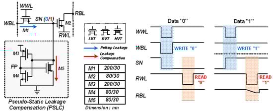 The PSLC is implemented with an auxiliary inverter with M3 and M4 and pull-down NMOS M5 for compensating the leakage current via M1. When SN stores data “0”, the auxiliary inverter turns on M5 to eliminate the leakage current injected into SN. As M5 forces SN to be zero, the PS-GC can maintain data “0” without the voltage increase. To minimize the subthreshold leakage current during the storage of data “1”, M5 is configured with the high-VTH (HVT) device.