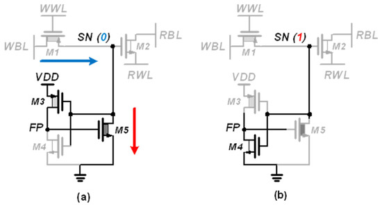 Figure 7 shows the details of the PSLC operation in the PS-GC. If SN stores data “0”, M3 turns on and M4 turns off, thereby making M5 compensate the leakage current. Then, M5 forces the SN node to be zero by pulling down the residual charge injected through M1 and M2. This compensates the leakage current and prevents bit flipping. Accordingly, the PSLC effectively extends the retention time for storing data “0”, realizing pseudo-static operation of the gain cell. If SN stores data “1”, only M4 turns on, and the feedback path (FP) node is forced to be zero.