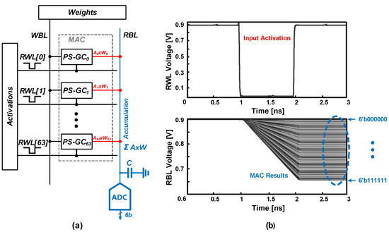 Figure 10a shows one of the analog PIM examples based on the PS-GC eDRAM. A column-wise MAC operation can be realized by the PIM using analog-to-digital converters (ADCs). The stored weights in the eDRAM are multiplied with RWL-encoded input data and accumulated in the RBL. For example, the RBL will be discharged when both weight and input data are “1”. Depending on the number of RBL discharging cells, the voltage at the RBL will be determined as shown in Figure 10b. Then, the column-wise ADC converts the RBL voltage, corresponding to the MAC result.