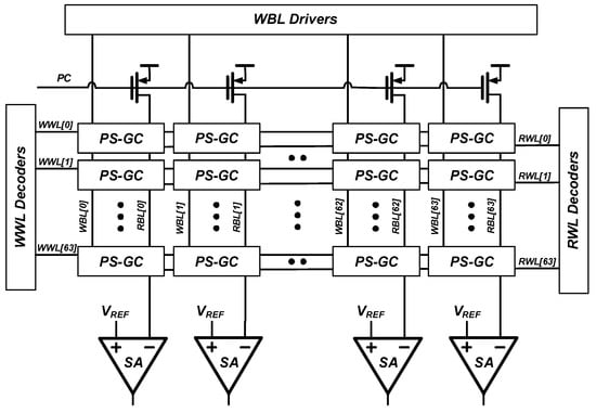 The NMOSs in the PS-GC are implemented with the minimum width and length available in 28 nm CMOS process to minimize the bit cell area. In case of the PMOSs (M1, M3), larger width of 200 nm was used for accelerating write operation and charge leakage compensation because the PS-GC should quickly turn on M5 when the leakage current via M1 increases the SN node voltage when data “0” is stored in SN.