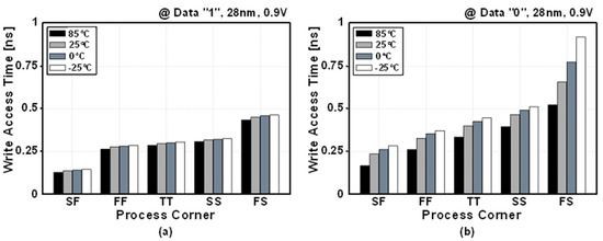 Post-layout simulated write-access times when storing data (a) “0” and (b) “1” across five process corners and four temperature cases.