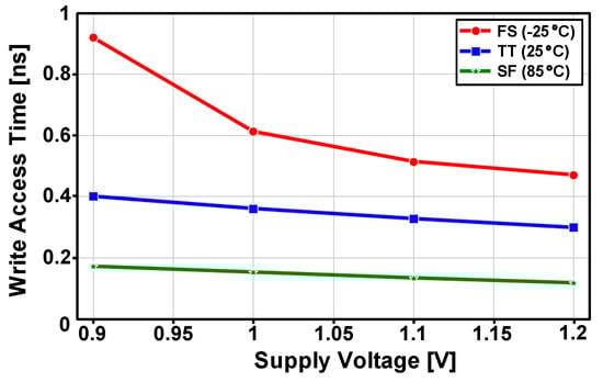 Figure 14 shows the post-layout simulated write access delay for supply voltages of 0.9–1.2 V. For the typical case (TT 25 °C), best case (SF 85 °C) and worst case (FS −25 °C), the eDRAM achieved a write-access time below 1 ns across the entire supply voltage range. As the PSLC allows the write access transistor (M1) to be implemented with a low-VTH PMOS without concern of increased leakage current, the PS-GC can achieve a fast write-access time.