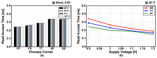 Figure 15a shows the post-layout simulated read-access times with the five process corners and four temperature conditions. The read-access time included the evaluation delay at the sense amplifier. The eDRAM achieved read-access time below 0.5 ns for all process corners and temperature conditions. As the read operation in the gain cell is performed using NMOS transistor (M2), the worst read-access time was observed at the SS and SF process corners. Figure 15b shows the post-layout simulated read-access time with voltage range from 0.9 to 1.2 V. At a supply voltage of 1.2 V, the eDRAM can provide fast read-access time below 0.2 ns for the typical, best and worst process corners.