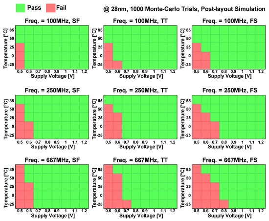To demonstrate the eDRAM operation under various operating conditions, post-layout Monte Carlo mismatch simulations with 1000 trials were conducted, as shown in Figure 16. With operating frequencies of 100–667 MHz and TT, SF and FS process corners, the eDRAM operation was evaluated under supply voltages of 0.5–1.2 V and temperatures of −25 to 85 °C. At this time, the SF and FS process corners were used in consideration of the worst performances for the read and write access operations. Under each condition, the eDRAM operation was marked as “Fail” if one or more Monte Carlo trials, including bit flipping, failed to operate normally.