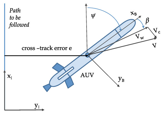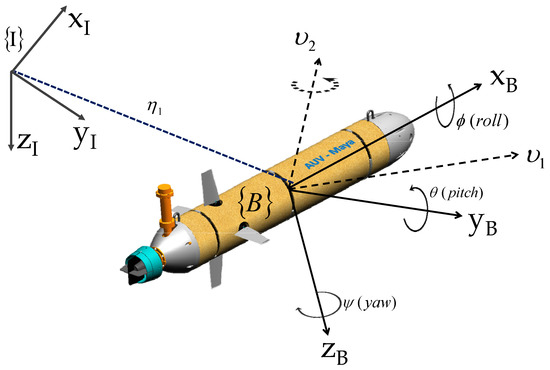 where m is the mass, is the moment of inertia about the vertical axis, , , and are added mass coefficients, , , and are linear damping coefficients, and , , and are the nonlinear damping coefficients of the AUV model. The compact form of these equations describing the motion of a marine vehicle which is three-plane symmetric can be written as [36]