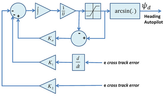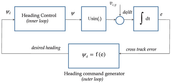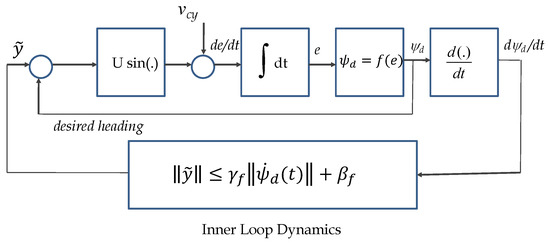 There is extensive literature on the path following, displaying a vast choice of available control laws based on linear and nonlinear techniques. Representative examples of path-following controllers for marine vehicles can be found in [23,24,25,26]. Furthermore, in [27], the authors described a nonlinear path-following guidance method in inner-outer loop form, where the outer loop plays a role of a guidance scheme, generating lateral acceleration commands, and the inner loop follows. This paper does not address the stability of the outer loop in the presence of the inner loop. This topic was addressed in [28] with the assumption that there is complete knowledge of the vehicle model parameters.
