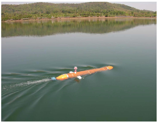 The Maya AUV is an axis-symmetric underwater vehicle developed at the National Institute of Oceanography (NIO), Goa, India. The Maya AUV [39] follows a low-drag hull with a removable nose cone which carries scientific sensors (see Figure 2 and Figure 4). It has a single propeller for propulsion and two pairs of stern planes to control depth and heading. The nose section can accommodate different sensors for specific missions at sea. The AUV is equipped with an attitude and heading reference system (AHRS), a Doppler velocity log (DVL) for navigation underwater, and GPS for surface navigation.