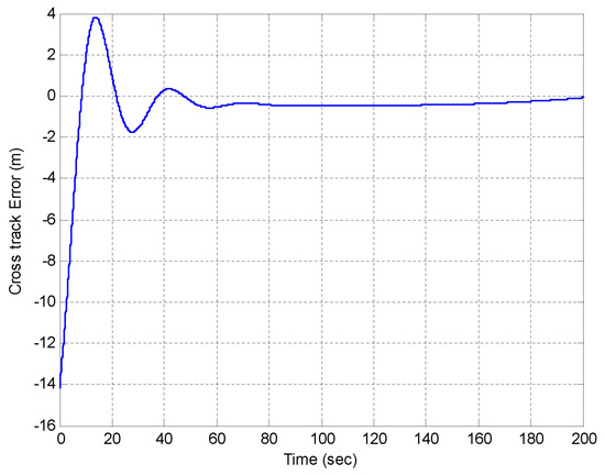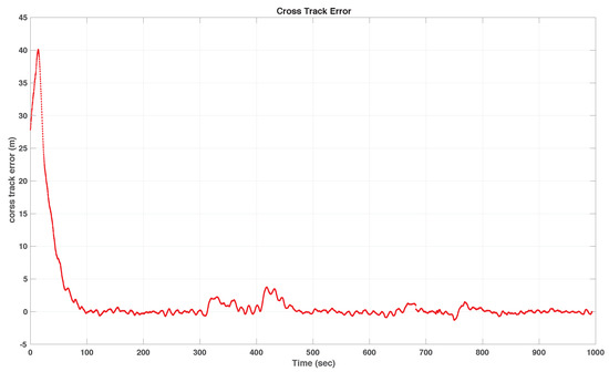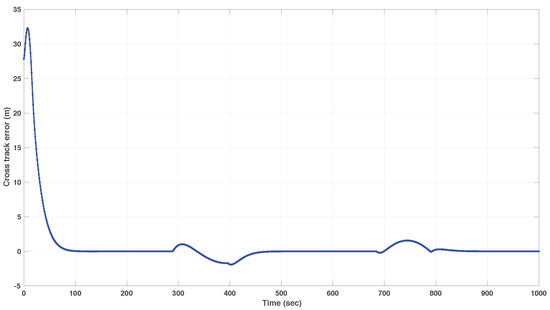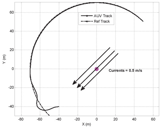 The simulation results in Figure 23 and Figure 24 illustrate the case where the vehicle is requested to follow a segment of a circular path. The results show that in the presence of currents, the vehicle follows the arc with an error (i.e., the cross-track error will not converge to zero but to a neighborhood of zero). The convergence of the cross-track error to a neighborhood of zero along segments of arc is also captured in the sea tests performed by and vehicles, as shown in Figure 18 and Figure 21.