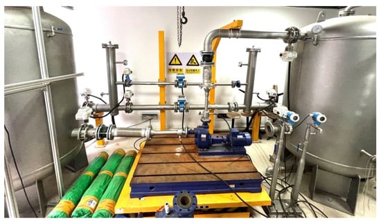 The centrifugal pump is driven by a variable frequency motor, and water flows into the system through the centrifugal pump. The operating speed of the centrifugal pump is changed through a variable frequency drive. At the same speed, adjust the outlet flow of the centrifugal pump through the opening of the outlet valve in the pipeline system. Under different valve openings V, according to the flowmeter, the pressure sensor, and rotation speed sensor record the outlet flow Q, the inlet pressure , the outlet pressure , and the rotational speed n, respectively. Additionally, the shaft power N can be obtained according to the power meter. The efficiency of different flow points is calculated according to Equation (1) [].