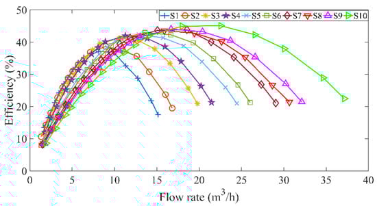 Collect the experimental data by adjusting the frequency of variable frequency drive and the opening of outlet valve, then obtain the efficiency curves at different speeds according to Equation (1). A total of ten efficiency curves at different speeds (i.e., 1200 r/min, 1320 r/min, 1560 r/min, 1680 r/min, 1920 r/min, 2040 r/min, 2280 r/min, 2400 r/min, 2640 r/min, 2900 r/min for the datasets of ) are collected from the experimental system including the efficiency curves at rated speeds, as shown in Figure 3.