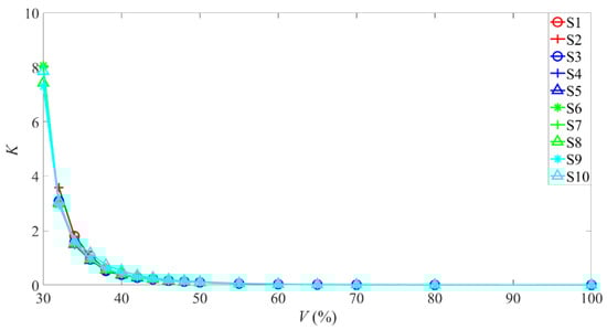 As shown in Figure 4, the curve of K values with valve opening at different speeds show two common characteristics. The first is, as the valve opening continues to increase, the K value decreases sharply, and when the valve opening is about 50%, the K value is close to zero. The second is, when the valve opening is between 30% and 50%, the K value of the same valve opening is not the same at different speeds. Therefore, for simplicity, the stage where the valve opening is larger than 50% is defined as a large flow stage, and the stage where the valve opening is less than 50% is defined as a small flow stage.
