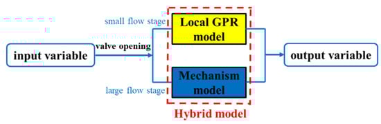 The two-stage hybrid modeling method can be implemented as follows. In the small flow stage, due to the influence of the system friction loss, the prediction result of the mechanism model is not accurate. Additionally, the opening of the outlet valve is small, the pressure difference between the inside and outside of the valve is large, and the valve opening is more sensitive to the change of flow, so more samples can be obtained. Therefore, according to the MEPP index in Equation (7), the LGPR model is trained using suitable sample sets of the small flow stage and it is used to predict the efficiency in this stage. This is different from the GPR model that is constructed using samples from the whole flow stage. In the large flow stage, the friction loss of system is small, and the mechanism model is used to predict the efficiency. First judge whether the test sample belongs to the large flow stage or the small flow stage according to the valve opening. As shown in Figure 5, if it belongs to the small flow stage, use the LGPR model to predict according to Equation (4); if it belongs to the large flow stage, adopt Equation (2) to predict.