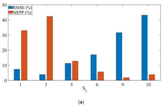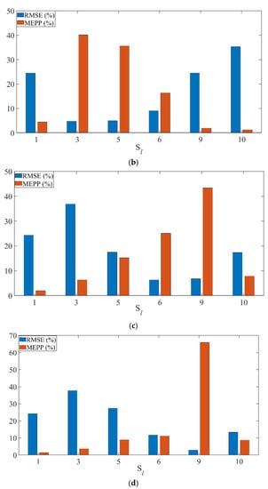 First, the effect of the MEPP index is verified. A larger value of MEPP means that the test sample set is more similar with the training sample subset of the training GPR model, thus the RMSE value is smaller. According to the four test sample sets of , ,  and , the MEPP and RMSE values of the GPR models trained by the corresponding six sample subsets are shown in Figure 7. The results indicate that the similarity between the test sample set and the training sample subset can be measured by the MEPP index, and a new training set can be formed by selecting more similar subset  to construct a suitable LGPR model at the small flow stage. For this case, the new training set of  is , the new training set of  is , the new training set of  is , and the new training set of  is , respectively.
