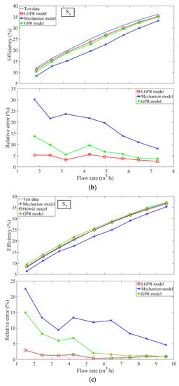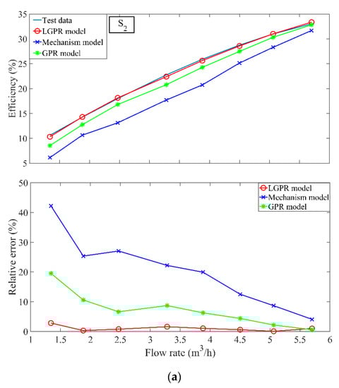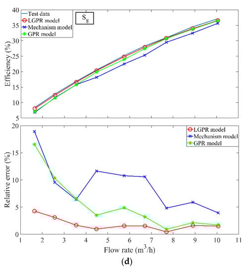 Since the valve opening in the large flow stage is large, the friction loss of system is small. The efficiency of the large flow stage is predicted by the mechanism model based on the pump affinity law of pump. The prediction result of the small flow stage for the four test sample sets , , , and  are shown in Figure 8. Compared with the GPR model and the mechanism model, the training set  is divided into two stages by the valve opening, and the training set  in the small flow interval is used. Notice that the GPR and LGPR models are trained with different samples. The LGPR model has good prediction performance for the small flow stage. As also shown in Table 2, the MARE values of three models validate that the LGPR model can be used in the small flow stage.