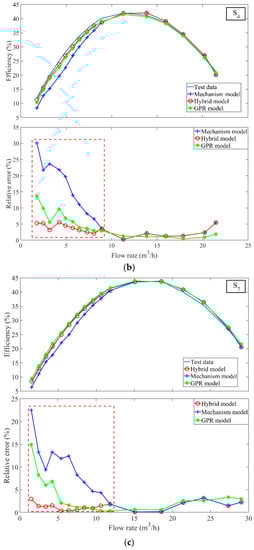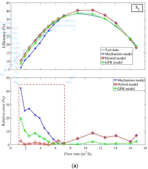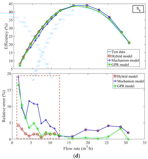 The hybrid model, the GPR model, and the mechanism model based on the affinity law of pump are compared. Table 3 lists the performance comparison results of three models. Among them, the hybrid model has the best prediction effect, while the GPR and the mechanism models are inferior. As shown in Table 4, the mechanism model requires the least experimental data (for the efficiency prediction of , , , and  datasets using Equation (2)). The main reason is that the mechanism model requires only the efficiency points at rated speed with the same valve opening as the test datasets (i.e., , , , and ). While the GPR model is purely data-driven and thus requires the most experimental data decided by the selected training samples (e.g., for  the training set is ). The hybrid model combines LGPR for the small flow stage and the mechanism model for the large flow stage. Consequently, the required samples can be separately determined for each stage.