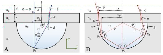 The relationship between the intersection number and the incident position of the light ray can be elucidated by considering the value of as shown in Figure 1. Taking the example of the ray in Figure 1B, as the incident position of the ray moves towards the origin, the intersection point will move closer to the cap until and ceases to exist. For some intersection number i, can be determined by summing the angles around the origin: