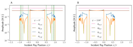 Before using the model developed here for physical predictions, it must be verified to yield sensible data in the case of both normal and oblique illumination. The amplitude of the rays created as a function of incident ray position are shown in Figure 3 for both illumination cases; this is equivalent to solving Equations (25)–() for each value. It can be seen that in the case of normal illumination (Figure 3A), the final amplitude is symmetrical about as would be expected. In addition, the lines in Figure 3A denoting the change of intersection numbers perfectly align with the discontinuities in the amplitude, as one would expect due to the addition of another factor of (see Equation (27)). On the other hand, Figure 3B shows that a small increase in incident angle is equivalent to shifting the graph for normal incidence to the left. This is intuitive as the rays will now have a small positive displacement in x, as can be seen in term 2 of Equation (30), meaning that their will no longer be equal to x and so appear to come from a position further to the right. The graphs also show how the p-polarised incident light leads to much lower amplitudes across the range, other than at near normal incidence, which is expected from the Fresnel coefficients. The drop off at in Figure 3A for p-polarised light is due to , where is the Brewster angle.