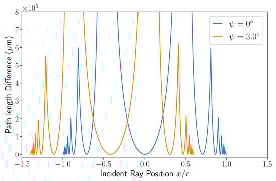 A graph showing the optical path length difference of a type c ray for both normal and oblique incidence ( and , respectively). The difference is defined to be with respect to a ray of and (i.e., solving Equation (18) and subtracting ). Data were simulated using the parameters as set out in the main text.