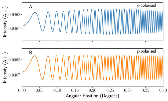 Graphs showing the interference patterns seen on a detector using the parameters as set out in the main body of text at a distance of with the angle given from the line of . (A) shows the interference pattern for s-polarised incident light, whereas (B) shows the pattern imaged for p-polarised light.