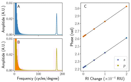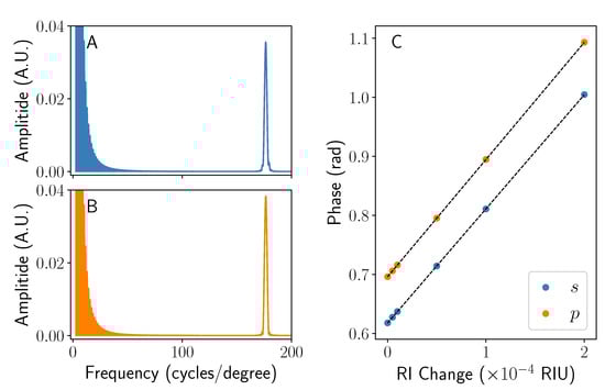 In a typical BSI experiment, a series of solutions with varying refractive indices are introduced into the semicircular channel, causing the fringes to be laterally displaced [22]. The position of these fringes can be monitored by tracking the phase of a peak in Fourier space. The sensitivity of the system can be determined by changing the refractive index of the fluid in system and noting the phase. This parameter is of great importance as it dictates the limit of detection of the system. For the semicircular channel simulated here, the fringes move laterally by and for s- and p-polarised light, respectively. This is shown pictorially in Figure 6C. These values (in addition to the phase value at ) can vary a small amount (∼1–2%) both in the simulation and experimentally depending on the choice of Fourier peak position, however the same position was maintained for both polarisation cases here. In addition, large changes in refractive index of the fluid (∼) can cause minute shifts in the position of the Fourier peaks, in turn modifying the phase of the chosen position (that is no longer exactly on the peak). Considering this, no errors on the sensitivities are given.