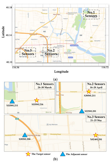 We selected six months of data from 1 January 2018 to 1 July 2018 as the historical data. The three groups of sensors selected data from three different periods for experiments according to their own data integrity. The code names, location distribution, and data acquisition time of the three groups of sensors are shown in Figure 1. Holidays were avoided in each period, and the data was chosen for 5 consecutive working days. The data collection interval was 5 min, so the number of samples obtained by each sensor in each period was 1440, and the data were complete without missing data.