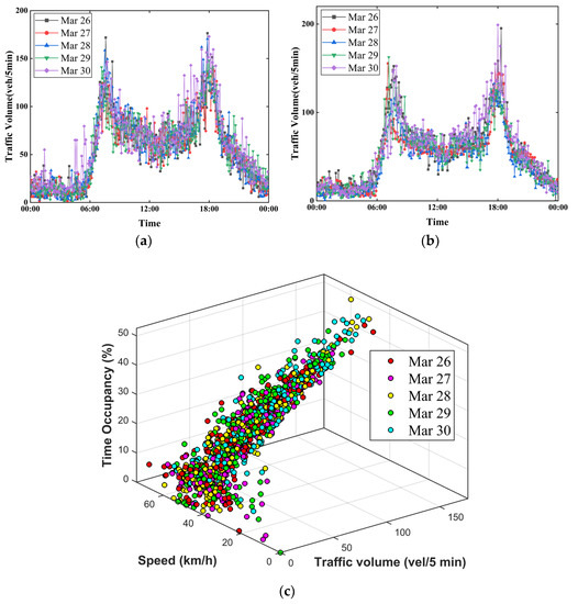 Various traffic sensors have been widely installed in the urban road network to obtain traffic data such as traffic flow, driving speed, time occupancy, following percentage, headway, and so on, which lays a solid foundation for traffic managers to analyze traffic flow change rules, evaluate traffic conditions, and formulate traffic control measures [1,2].