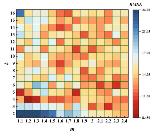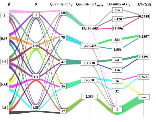 As shown in Figure 7, the value of directly affected the number of grid center points in , and the scale of increased greatly with the increase of , while the value of directly affects . When the values of and were small, such as , , the size of was 2380, which was easy to calculate. Nevertheless, was an empty set, and we could not get the clustering center that met the requirements. When the values of and were too large, such as , , the size of was more than 19 million, which led to a great increase in the complexity of calculating the XB index, and the optimal XB index 0.2348 was very close to the XB index 0.2357 in other schemes.