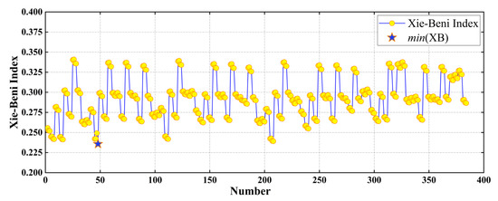 Step 5: determine the values of and in Step 4 according to the scale of . The values are based on lower computational complexity and better clustering effect, which means calculating the XB index for each group of clustering centers in n according to Equation (12). A smaller XB index indicates a better clustering effect of the current cluster center. The cluster center with the smallest XB index in m is selected as the initial cluster center of FCM.