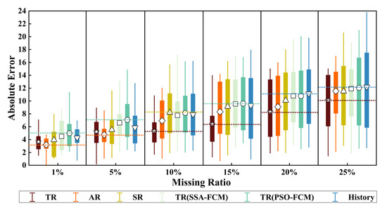 The mean of the absolute error is the most important information. A small mean value means there are more repaired data close to the real data. We added two “shot dot” lines to each missing ratio, representing the extreme value of the Mean Absolute Error (MAE) of each scheme. This makes it easier to show the difference between the mean and the extreme value of each alternative.