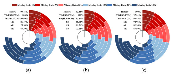 The 6 arcs in each subgraph represented 6 different schemes. Different colors represented RMSE values under different missing rates. Percentages in the figure represent the ratio of RMSE accumulated by the current scheme to the maximum RMSE scheme.