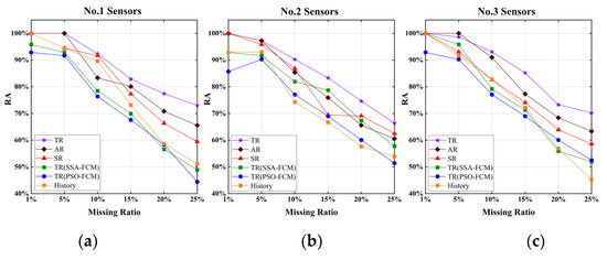 The RA of different schemes on different groups of sensor data. (a) RA of the No.1 sensors; (b) RA of the No.2 sensors; (c) RA of the No.3 sensors.