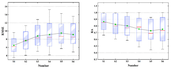 Summarizing the data in Figure 10 and Figure 11, we get the box plot of each scheme, as shown in Figure 12. The red line in the figure was the median line, and the green square was the mean value. It could be seen that S1 had the best effect. The median and average values of RMSE and RA were significantly ahead of other schemes. S4 had the greatest volatility, but the overall effect was still ahead of S5. Both S5 and S6 were poor solutions.