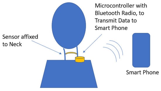 A neck-mounted wearable prototype was developed and used for classifying neck movement, mouth movement, and speech. The prototype consists of a sensor affixed to the neck which is connected to a microcontroller. The data collected from the sensor is wirelessly transferred via Bluetooth by the microcontroller to the user’s paired smart phone. On the smart phone, the time-series data is in real time filtered, classified, and then used as input to a software application. Figure 1 provides an overview of the wearable system and its components interactions.