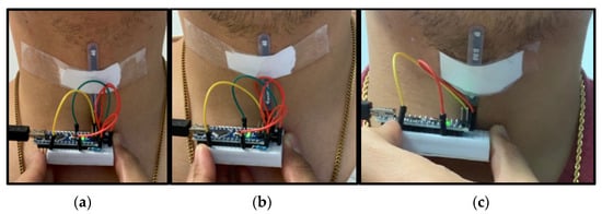 (a) Low, (b) center, and (c) high placement of the short flex sensor along the center line of the neck.