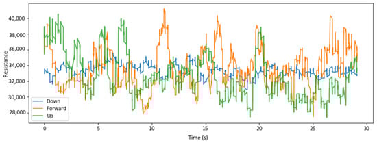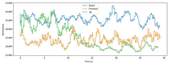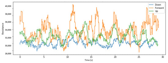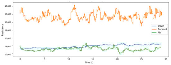 We visualize here some of the data collected across various placements of the sensors and for different head tilts. Figure 4, Figure 5 and Figure 6, respectively, display the collected resistance data over a 30-s time frame across the first three classes of head tilts, namely down, forward/no tilt, and up, for each placement of the short sensor, namely low, center, and high placement. Figure 7 displays the collected resistance data over a 30-s time frame for the long sensor, across the first three classes of head tilts, namely down, forward, and up. The data represented has been filtered using a moving average filter.