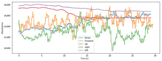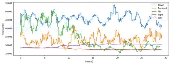 The short, low sensor placement and the long sensor (Figure 4 and Figure 7, respectively) show the clearest distinction between the three classes. Therefore, the short, low sensor placement and the long sensor were further evaluated using all five classes of head tilts, namely down, forward, up, right, left. The collected resistance data over a 30-s time frame are shown in Figure 8 and Figure 9, respectively.