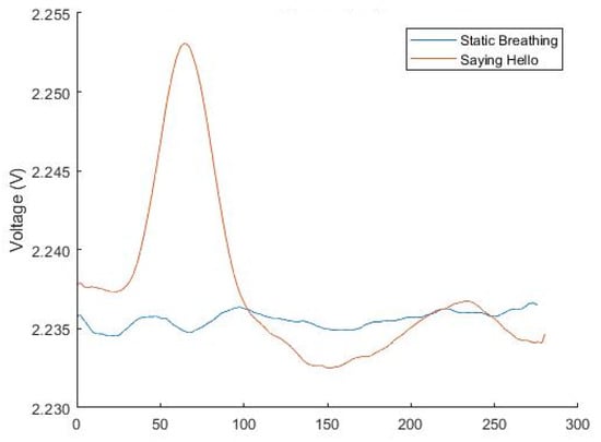 Figure 10 shows an example sensor reading from static breathing and from talking, specifically saying ‘hello’, on the same graph. The visualization demonstrates that the presence of speech can potentially be differentiated from static breathing using only the data collected from the flex sensor on the neck-mounted prototype.
