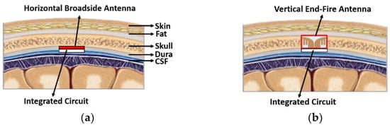 Typically, a brain-implanted antenna is located under the skull, immersed horizontally in the dura or cerebrospinal fluid (CSF), as shown in Figure 1a. This circumstance lowers the antenna gain because the skull is thick (~7 mm at the bregma) and lossy (loss tangent, tanδ, ~0.3) [14,15]. A full-wave electromagnetic simulation study indicated a reduction of at least 2 dB in antenna gain because of the thick skull. Deformation of the antenna radiation pattern is another issue. A broadside antenna horizontally placed under the skull is expected to radiate toward the zenith. However, unexpected large back lobes and side lobes are often seen after implanting an antenna in such a complex brain environment [16], i.e., the broadside radiation is not guaranteed because of the impact of the thick skull layer, high permittivity brain tissues, and small antenna ground plane.