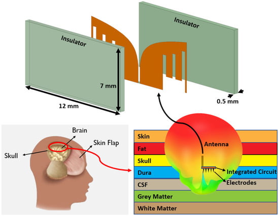 - Hout, S.; Chung, J.-Y. Design and Characterization of a Miniaturized Implantable Antenna in a Seven-Layer Brain Phantom. IEEE Access 2019, 7, 162062–162069. [Google Scholar] [CrossRef]