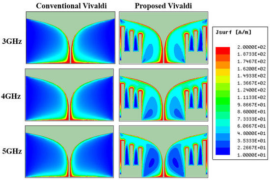 Comparisons of surface current densities of conventional and proposed Vivaldi antennas.