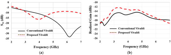 Comparisons of (a) S11 and (b) realized gain of conventional and proposed Vivaldi antennas.