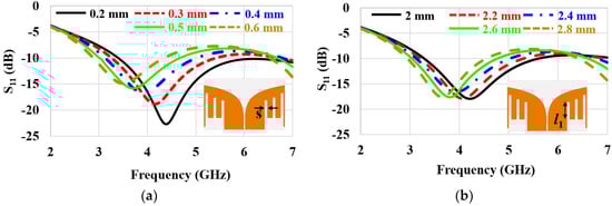 Figure 6 shows parametric studies of S11 by altering the slot’s geometry. The width of slot (s) can be used to tune the antenna’s resonant frequency (see Figure 6a). Here, s between each slot is set to be the same to make the optimization process concise. The wider s shifted the resonant frequency toward the lower end, resulting in antenna miniaturization by introducing more slot inductance than capacitance. Slot length (l1) was another parameter for adjusting the resonant frequency (see Figure 6b). The longer l1 provided more inductance without altering the capacitance. Therefore, the resonant frequency shifted left with increasing l1. We note that l1 is the length of the first slot. The second and third slots were longer. Their lengths were determined by the Vivaldi’s exponential curvature profile at the middle. In particular, l1 = 2.4 mm, l2 = 2.8 mm, and l3 = 3.4 mm. Table 2 lists the final antenna’s geometrical parameters. These values were obtained for the target frequency range, 3–5 GHz, with the given antenna space, 12 mm × 7 mm; however, the s and l parametric optimizations can be applied for any frequency band and antenna size.