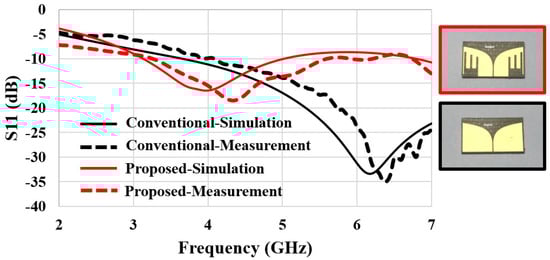 Comparisons of measured and simulated S11 of conventional and proposed Vivaldi antennas.