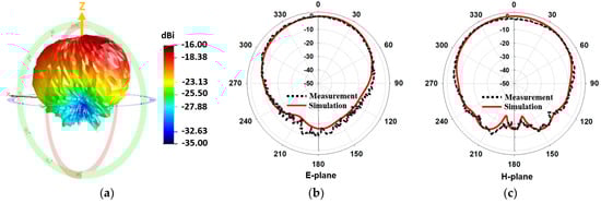 Radiation patterns of the antenna prototype inside the phantom at 4 GHz: (a) measured 3D radiation pattern, (b) measured and simulated 2D E-plane radiation pattern (normalized by the peak), and (c) H-plane radiation pattern (normalized by the peak).