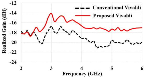A comparison of measured realized gain of the conventional and proposed Vivaldi antennas.