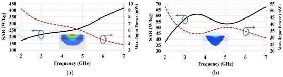 SAR values were computed and analyzed using the same simulation setup as the antenna performance analysis (see Section 2). Figure 14a,b show the simulated SAR-1g and SAR-10g for various frequencies after supplying an input power of 1 W to the antenna embedded in the bone layer. The SAR-1g in Figure 14a continuously increased with increasing frequency, while the SAR-10g in Figure 14b shows a peak and null at 3.6 GHz and 5.1 GHz, respectively. The SAR values were very high because of the high input power of 1 W, e.g., 240 W/kg and 59.4 W/kg at 4 GHz for SAR-1g and SAR-10g, respectively. However, the actual SAR is expected to have a much lower value because the power consumed by the RF-front-end of implantable devices generally lies within 100 μW to a few mW [31]. Hence, we calculated the maximum allowable input power to the antenna that satisfied the SAR-1g (1.6 W/kg) and SAR-10g (2 W/kg) criteria. They are marked by the red dashed lines. The SAR-1g criterion can be fulfilled as long as the input power is less than 5.9 mW for the frequency range of 3–5 GHz as in Figure 14a. The maximum allowable input power for the SAR-10g was 33.6 mW as in Figure 14b, which is less stringent than SAR-1g.